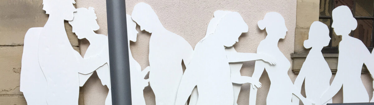 In der Stadt Bad Salzungen liegen an fünf Orten im Stadtzentrum 16 Stolpersteine. Hinter jedem Stein steht eine Geschichte, eine menschliche Biografie. Wie aber setzen wir diese biografischen Daten um in etwas, das uns selbst und jeden anderen angeht und sogar berührt? Die Künstlerinnen Ulrike Kraus und Heide Dittmann-Ortner haben in Übungen und Spielen Annäherungen geschafft, daß wir uns in die Personen hinein versetzen und dafür Ausdruck und Bilder finden konnten. Diese Übungen sind dann eingeflossen in lebensgroße Sillhouetten, für die die Teilnehmer*innen selbst die Schattenbilder waren – das heißt, das hier und jetzt ist in die Auseinandersetzung eingeflossen. Es sind Figuren entstanden zu den historischen Personen aber durch Abbilder heutige Schüler*innen. Vielleicht bekommen sie dadurch etwas allgemeingültiges. Zu den Silhouetten gehören Koffer, historische Koffer, die wir über den Sommer per Spendenaufruf sammeln konnten. Der Koffer steht für Reise, für Unterwegssein und eben auch für Flucht. Die Schüler*innen haben die Koffer unterschiedlich verwendet; mal sind Dinge darin gesammelt, die den dargestellten Menschen wichtig waren, die sie ausmachten oder die einen kleinen Ausschnitt aus ihrem Leben erzählten. In einem Koffer liegt ein Baby… zu einem anderen sind Steine verknüpft…
