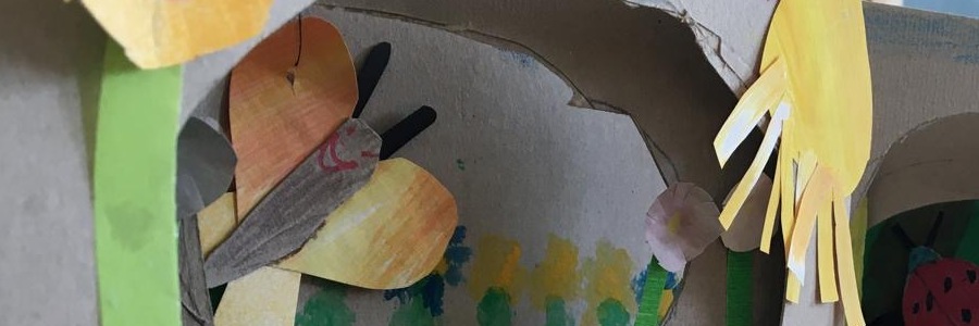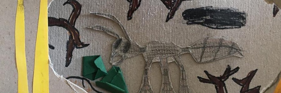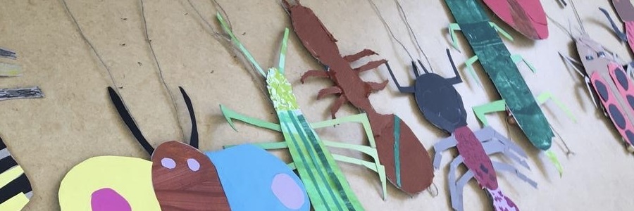 Am Dienstag hatten wir die drei 1. Klassen im Abstand von ca. 2 Stunden. Mit ihnen haben wir Insekten gebaut, geklebt aus farbigen Papieren, die auf einem Papp-Lebensraum zum Leben erweckt wurden. Sie haben sehr viele Ideen gehabt wie z.B. einen Insekten-Fußballplatz.